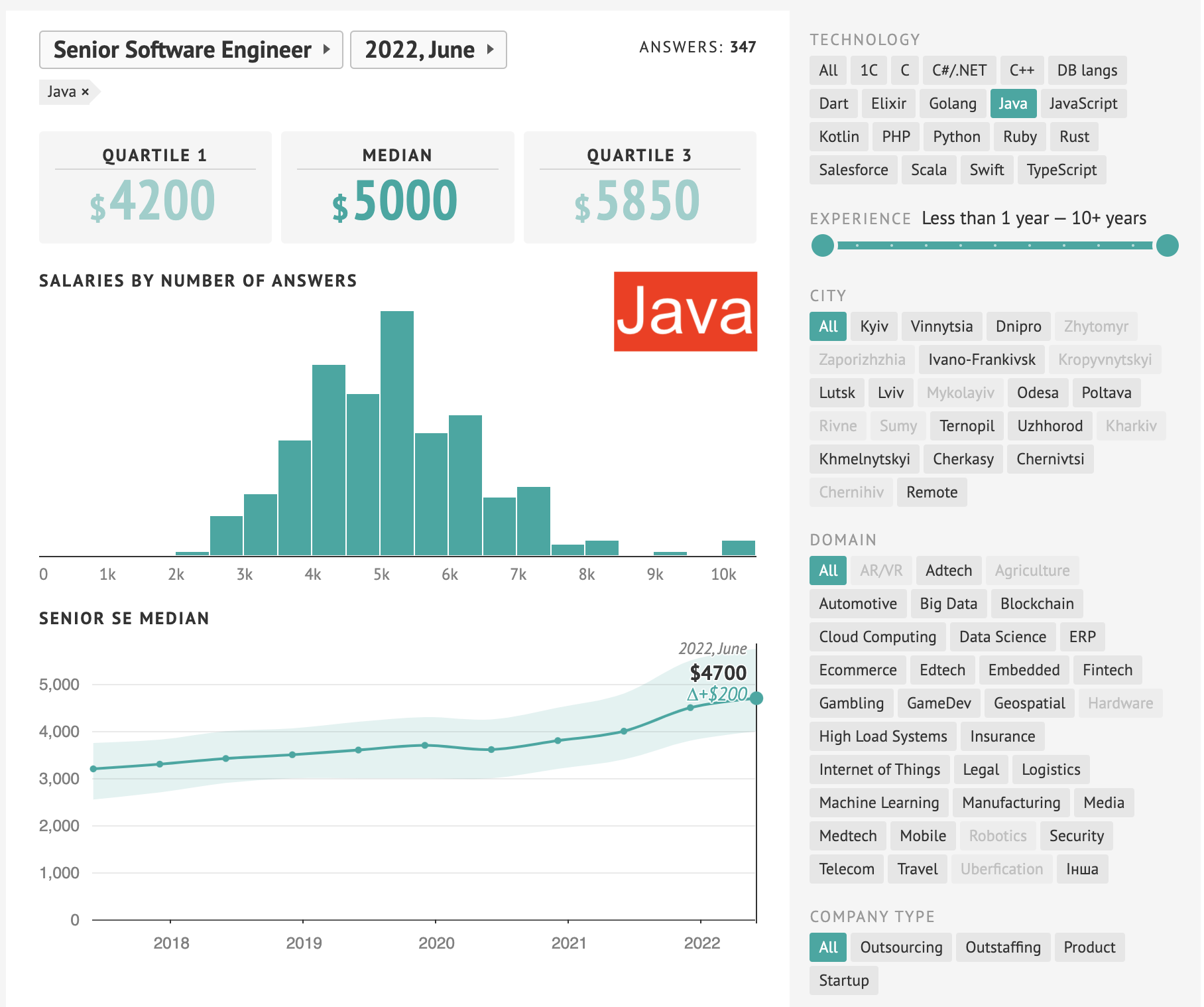 According to the community of Ukrainian developers, the salary of a Senior Software Developer differs depending on the programming language.
